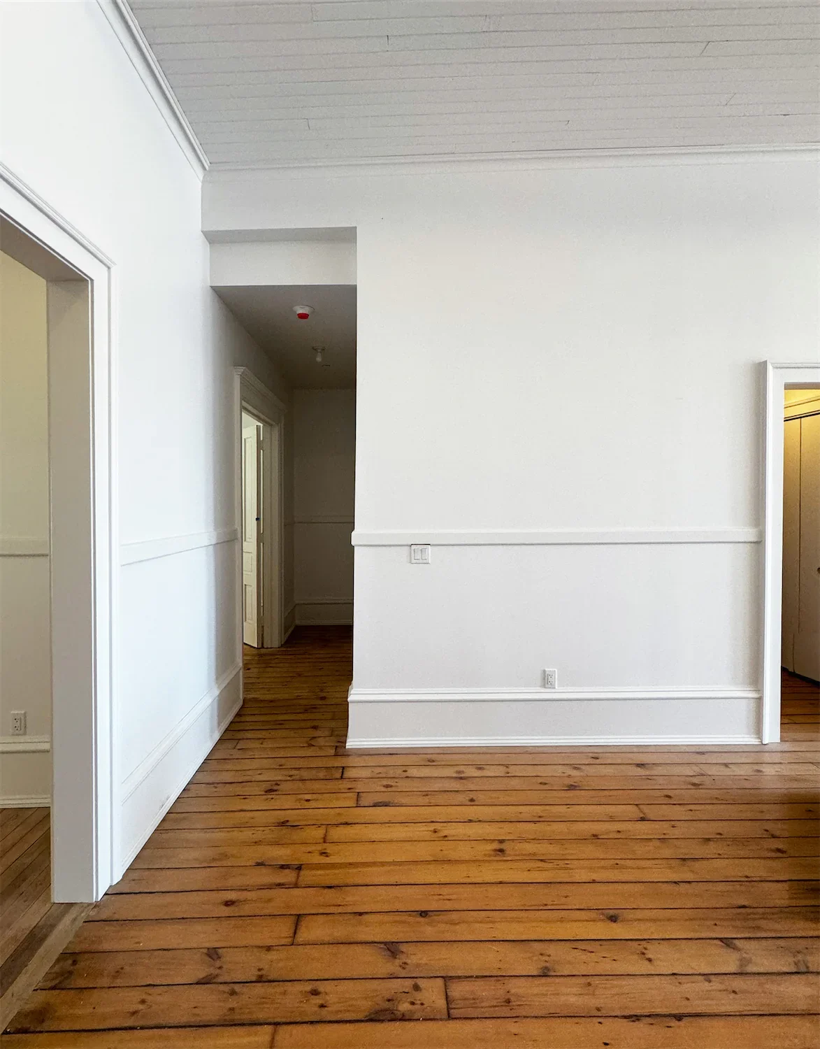 The kitchen has counter space. The living room is 550 square feet; room for guests without feeling crowded. The primary suite is generous. Original 1866 hardwood floors preserved throughout. Exposed brick from the original Masonic lodge. High-end built-in appliances that integrate seamlessly. The kind of details that signal quality without announcing themselves.