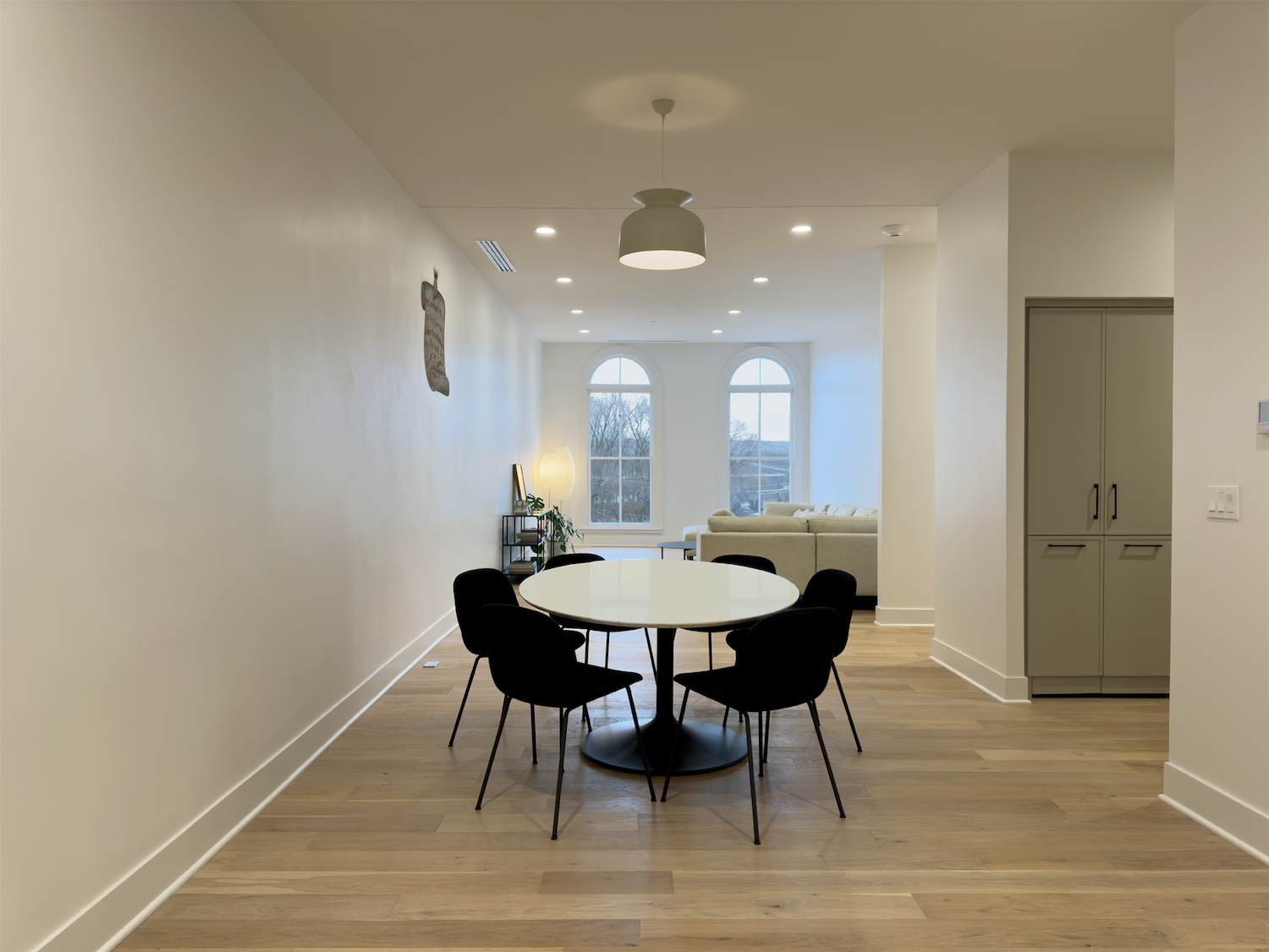 The layout works: 338-square-foot living room, separate 198-square-foot dining area, 224-square-foot family room, 117-square-foot kitchen with counter space. Two bedrooms; one primary, one guest room or office. Two full bathrooms. Vaulted ceilings. Original 1866 hardwood. Exposed brick from the Masonic lodge. High-end built-ins placed thoughtfully; cabinets where you need them, storage that makes sense.